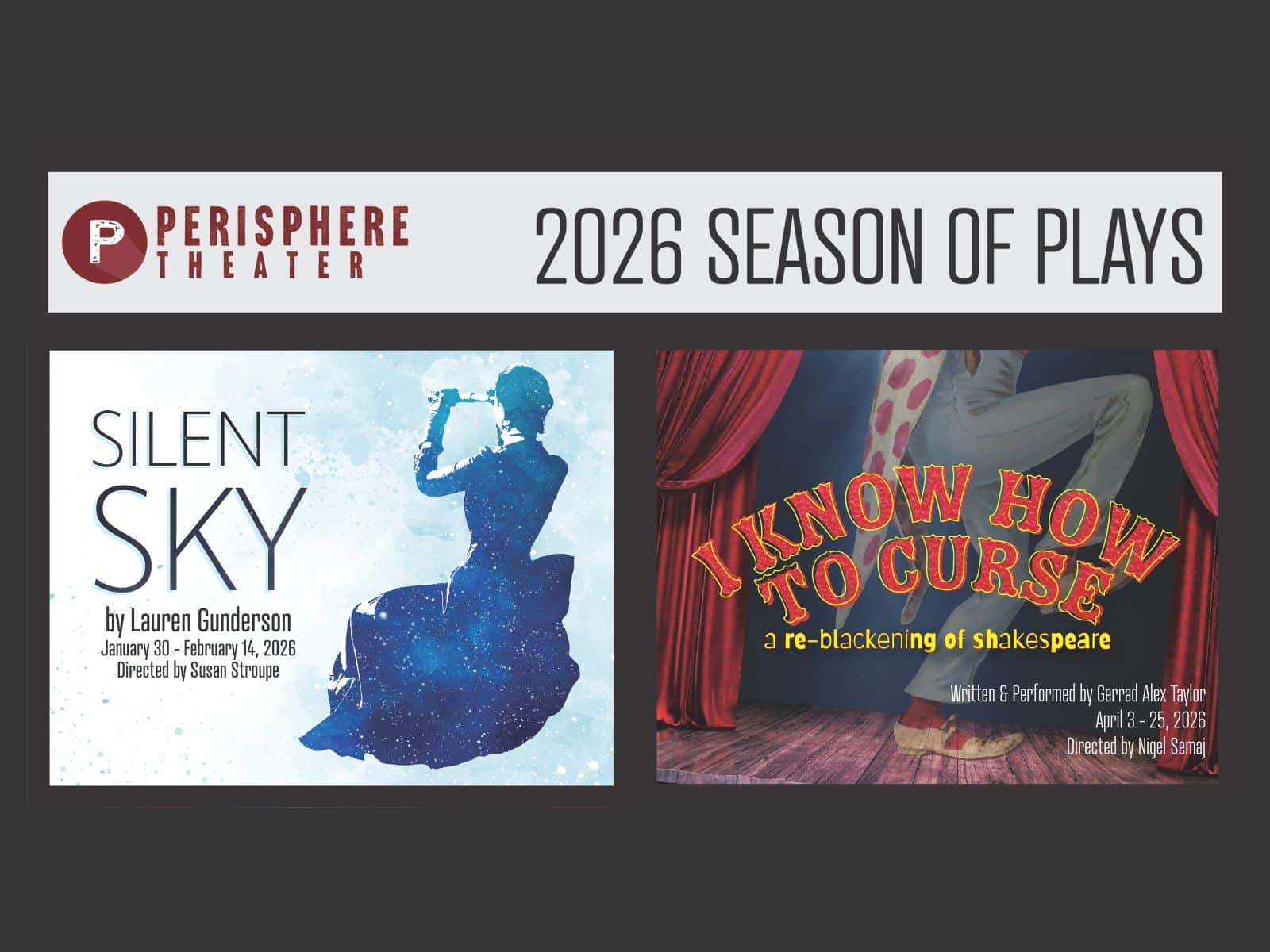 Montgomery County-based Perisphere Theater has announced its 2026 season: Silent Sky, by Lauren Gunderson, and I Know How To Curse: a re-blackening of shakespeare, a new one-man show written and performed by Perisphere’s co-artistic director, Gerrad Alex Taylor. Performances will be held at The Writer’s Center in Bethesda.