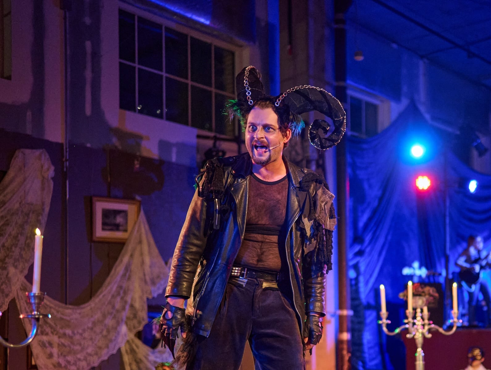 Directed by Jenny McConnell Frederick, So Late Into the Night catches us by the throat and leads us briskly into a confrontation with fate. The production, however, most immediately succeeds thanks to its unique and immersive stage design. Set designer August Henney seats everyone — some audience members included — at an oversized table doubling as the stage where this satanic seance becomes as much an experience as a theatrical event. Dean Leong’s lighting design infuses the warehouse venue with ghoulish rock-glamour. From sultry flickers of candlelight to brazen LEDs, plus proto-period costuming by Jessica Utz, the overall aesthetic evokes a sense of transcendent liminality. It appropriately splits us between the play’s two major settings: a grungy Dayton music hall and the enchanted Geneva dinner party. Brandon Cook’s sound design adds extra spooky flavor to the already damning occasion.