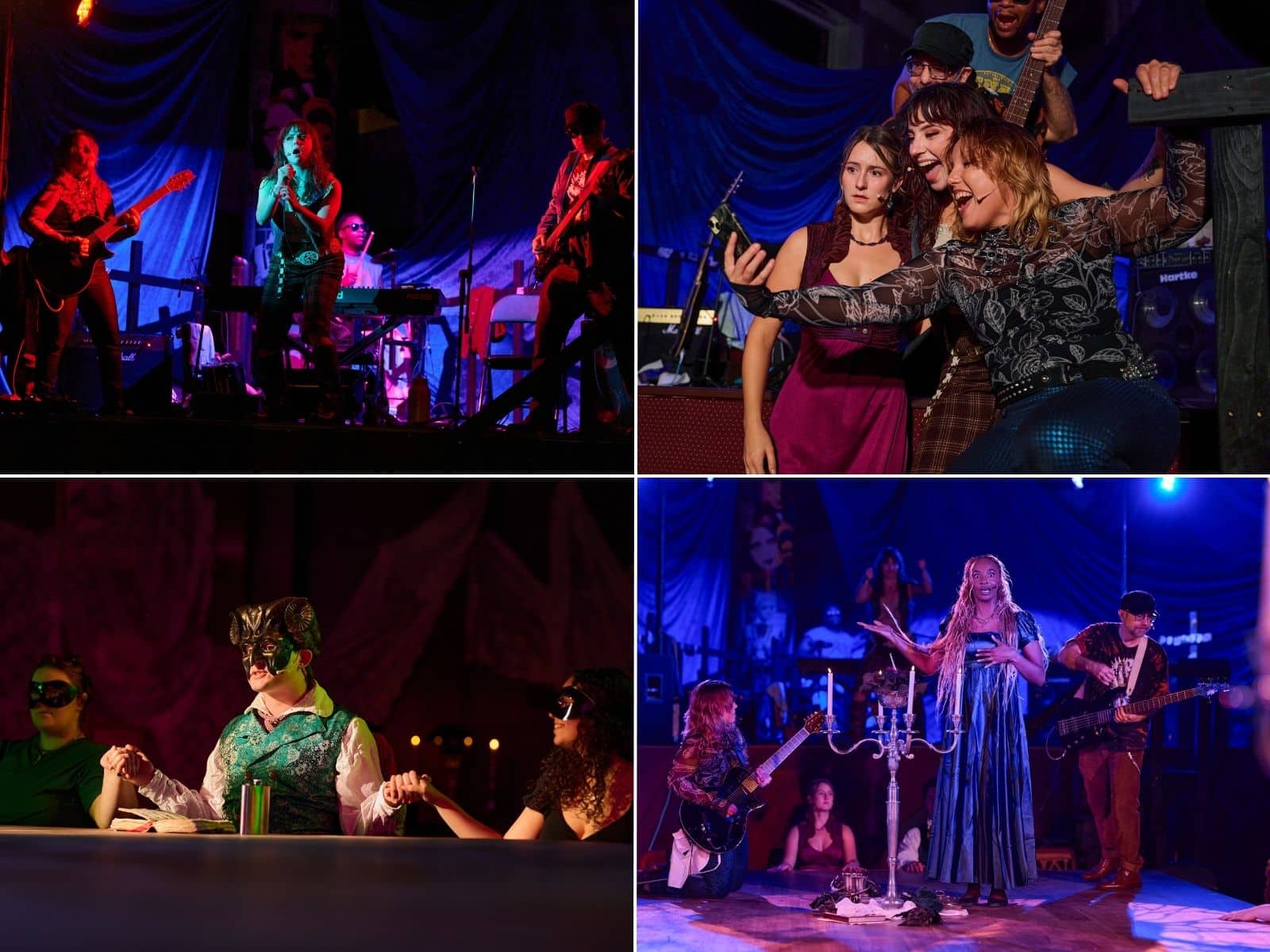 Isabelle Jennings Pickering plays the altruistic Mary with great attention to character detail, conjuring us into the writer’s innermost heartache. Maxwell Ross is equally compelling as her soon-to-be husband, Percy, whose death scene is among the most tragic and heart-pounding moments of the play. Paul Pelletier Jr plays the infamous cad Lord Byron as such, but with the slightest hints of insecurity beneath his proud demeanor. Jason Zuckerman plays Polidori admirably but demonstrates remarkable range with a number of secondary roles as well. Finally, Sydney Dionne is enchanting as Claire, the figure we know the least and thus hold the most curiosity about. Lydia Gifford as Trillian (lead vocals/keys) is a compelling narrator and virtuosic musician. She is accompanied by Veronica Rose Bundy on guitar, Billy Bob Bonson on bass, and Dani Ray on drums, all of whom come well equipped with snarky commentary and alt-’90s flair.