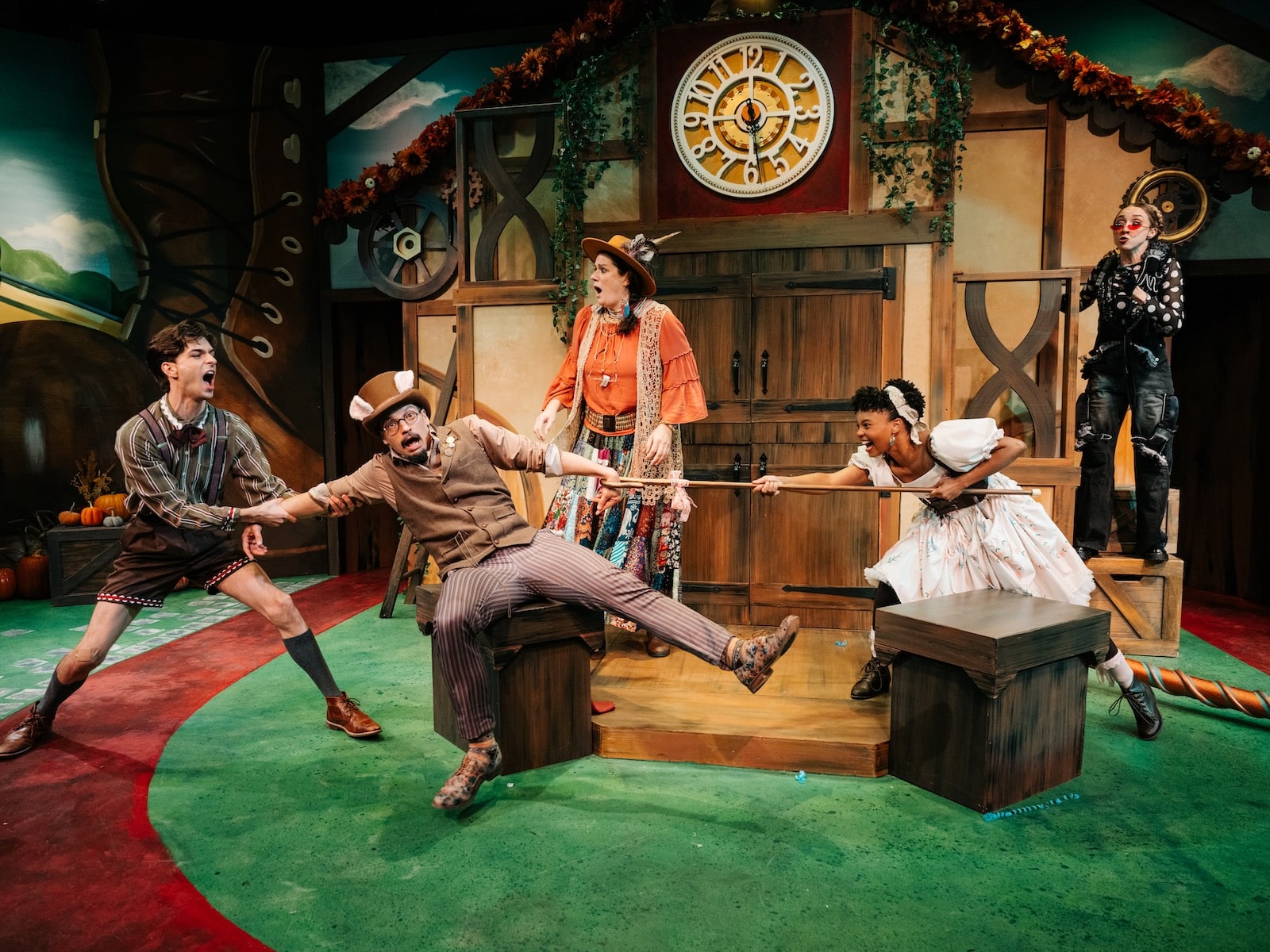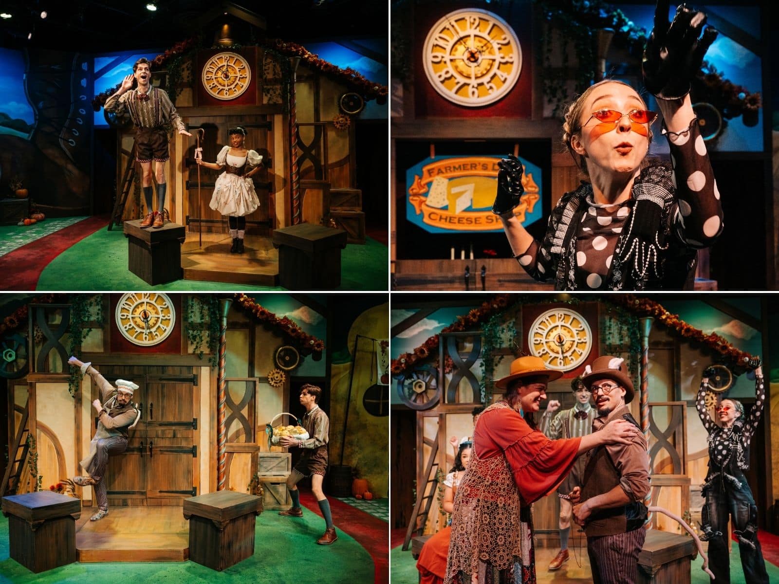 While four main characters carry the show, it feels like the entire nursery rhyme world has moved into the prominent full-size work boot that nearly grazes the rafters on stage, and, along with a clock tower and a waterspout, makes up the bulk of the set. (Handiwork by scenic artists Megan Holden and Salem Clouse.)