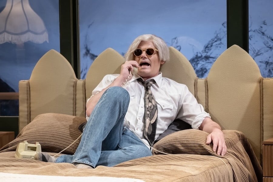 The show, now extended through July 6, begins with Warhol — played by a radiantly comic Alex Mills — musing about his detachment.
