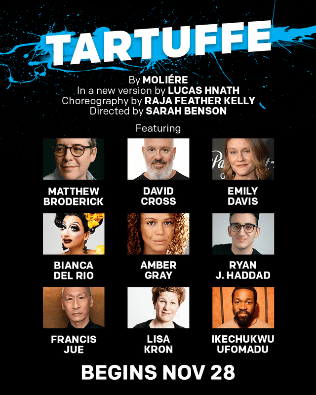 Tartuffe plays November 28, 2025-January 11, 2026, at the New York Theatre Workshop, 79 East 4th Street, NYC. For tickets (priced at $25-179, plus fees), call (212) 460-5475, go online, or find discount tickets at TodayTix.