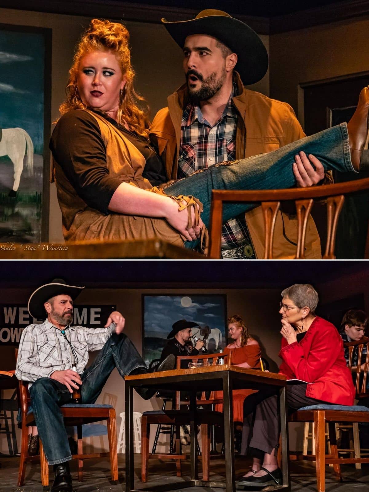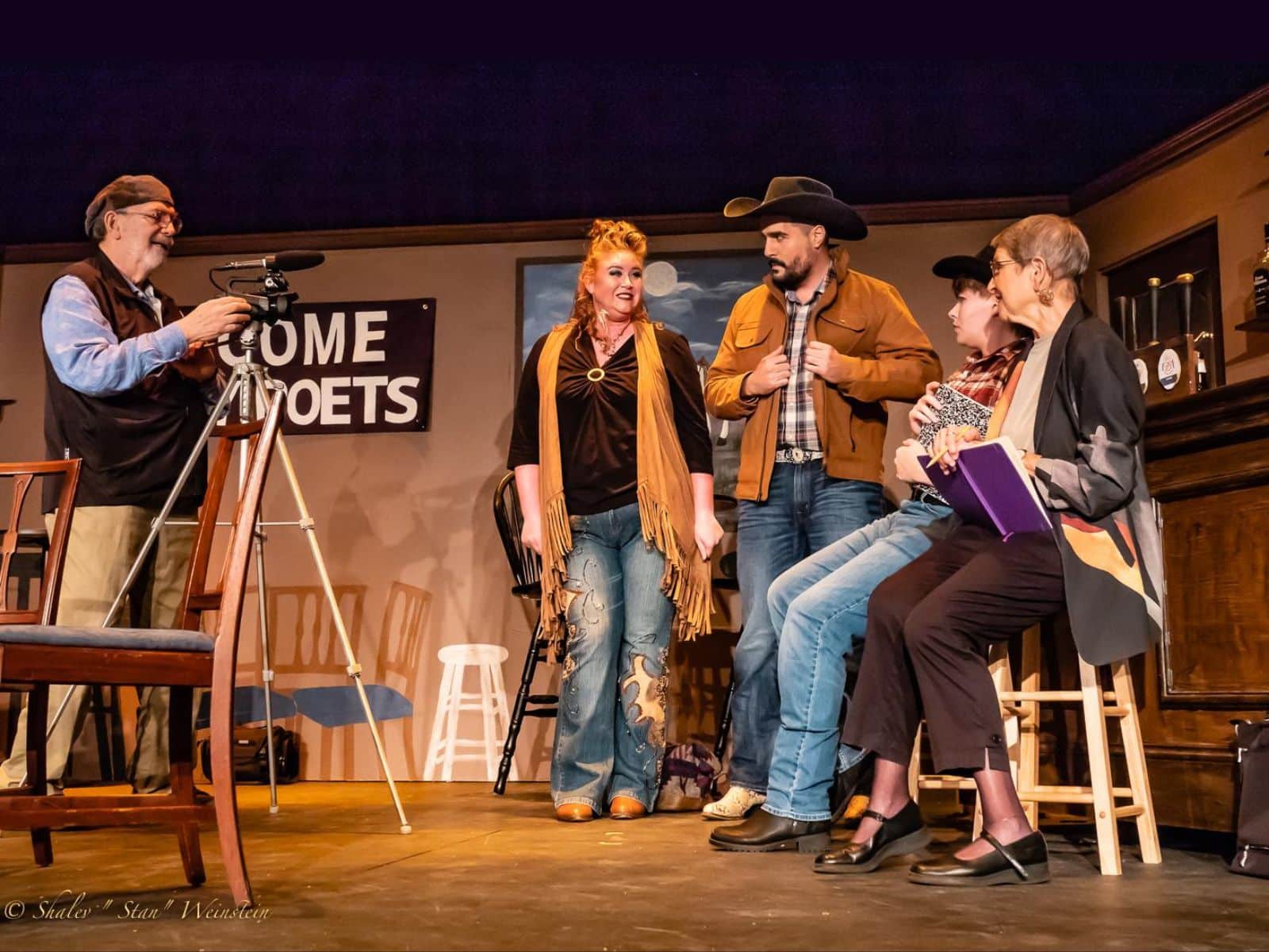 In depopulated Spitwhistle, Texas, the Saddle Horn Bar can attract only a handful of contestants. There’s the young Henry Burke (Jaye Frazier), a poetry rookie competing for the first time. Frazier’s Burke is appropriately insecure and callow. In counterpoint, Williams gives us Boone Hawkins (Raymond G. Gagliardi), a longtime veteran of the cowboy poetry world, who shows genuine kindness to Henry. I’d have liked Boone’s hair and makeup to be more suggestive of the older Willie Nelson, better to portray the character’s near-the-end-of-the-trail situation in life.