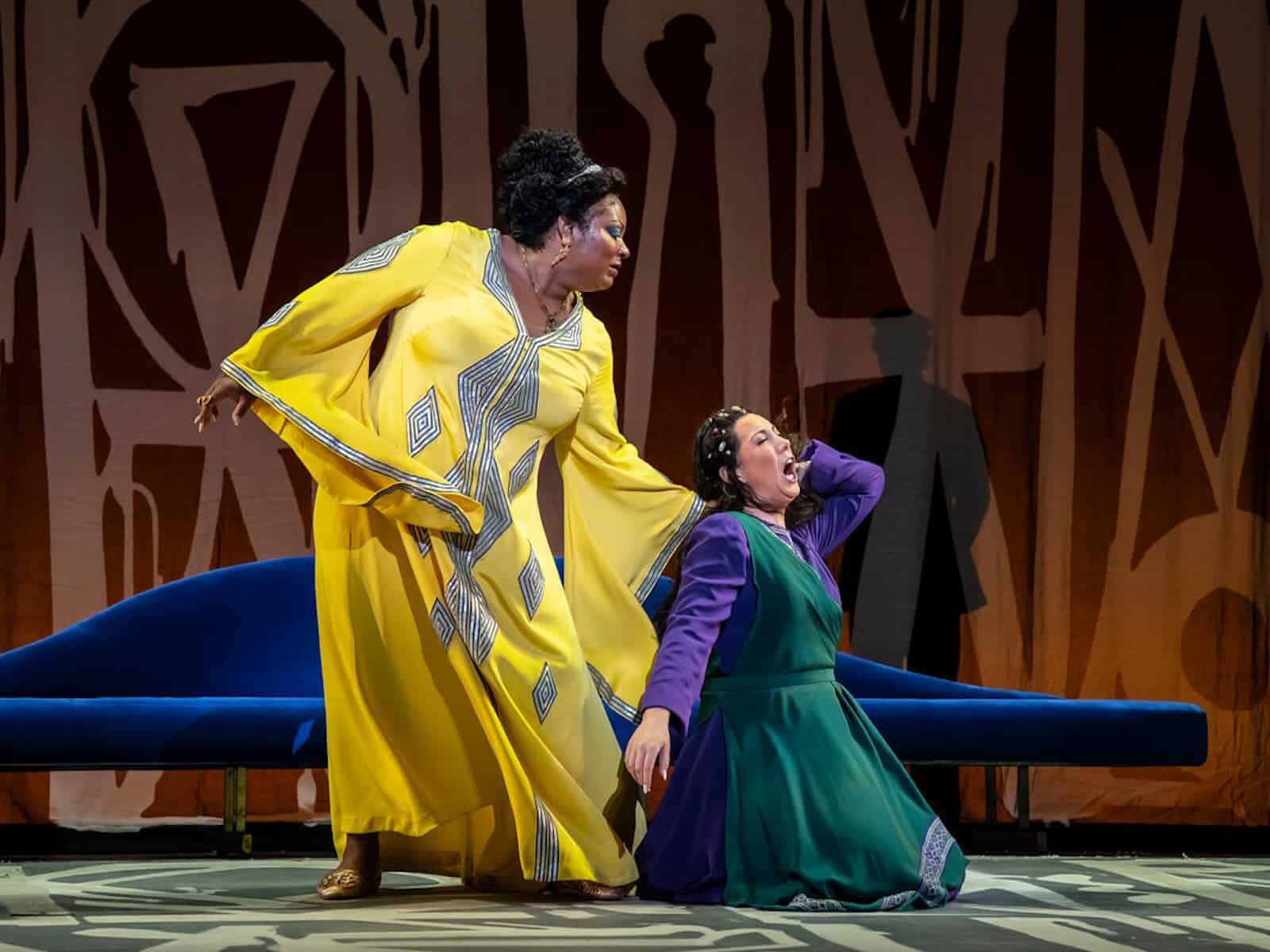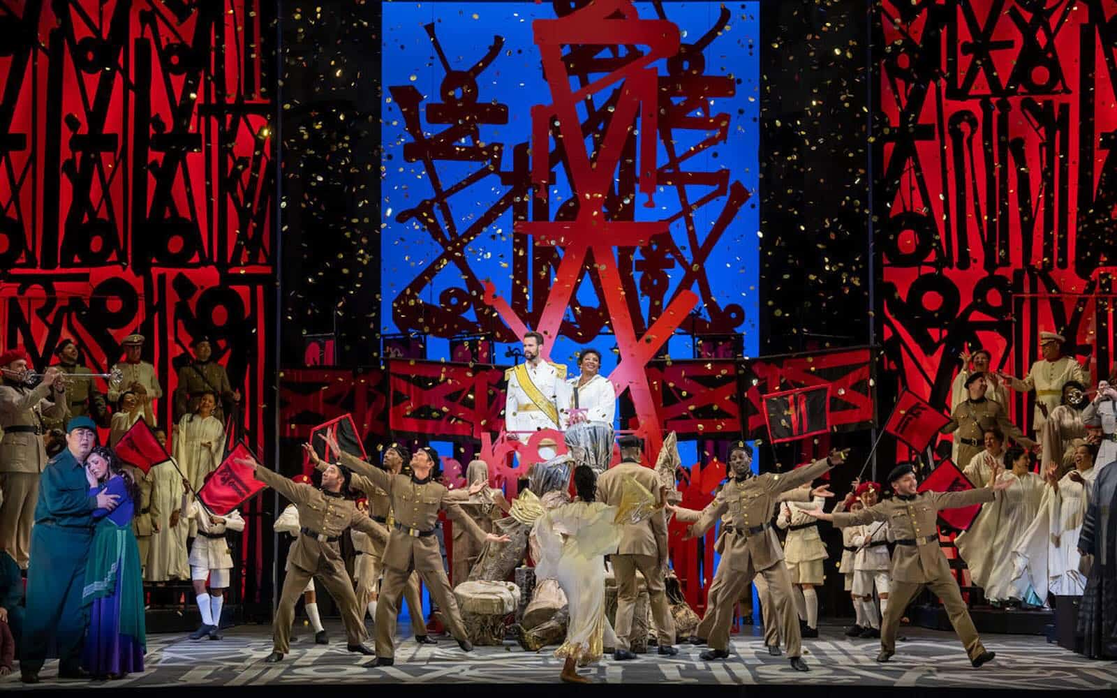 In 2017, the contemporary artist known as RETNA got top billing for his contributions to the opera’s overall design, and his calligraphic projections with their nod to Egyptian hieroglyphics seemed bold and innovative. In this rerun, they seemed somewhat arbitrary and finally tiresome. Some shifts in the panel projections and lighting, happening in the middle of a duet or trio, even distracted from the emotional storytelling.