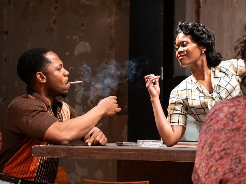 Key to creating the environment of this theater noir was the standout production team at Studio Theatre — literally transforming the Victor Shargai Theatre into the Paradise Club, with tables and chairs and a real bar. Direction by Raymond O. Caldwell orchestrated an enthrallingly frenetic current of energy, emotion, words, and action, electrically complemented by Intimacy Coordinator Sierra Young and Fight Choreographer Robb Hunter. The tactical and immediate set design by Lawrence E. Moten III allowed the audience to play both patron and ghost watching the tumultuous week unfold, and the lighting design by Keith Parham flickered and dimmed along with this production’s heart-stoppingly immersive staging. Musical direction by William Knowles and sound design by Matthew M. Nielson, along with musicians Michael A. Thomas (trumpet) and Mark Saltman (bass), wove together a soundtrack that caused your soul to relax and your pulse to race.