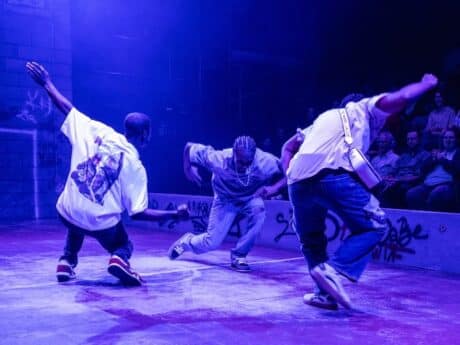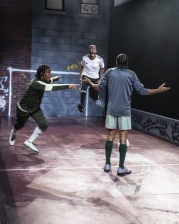 Nadir Bey’s scenic design sets the stage for “the endz” and bookends the red pitch with one goal spray-painted on a graffiti-covered brick wall, and the other goal formed by a rectangular piece of wood. Fencing and scaffolding at each end of the stage evoke the ongoing demolition and construction of the gentrifying neighborhood. The three friends’ shared ritual of slapping the sign on the fence as they enter and exit the red pitch punctuates the play from start to finish.