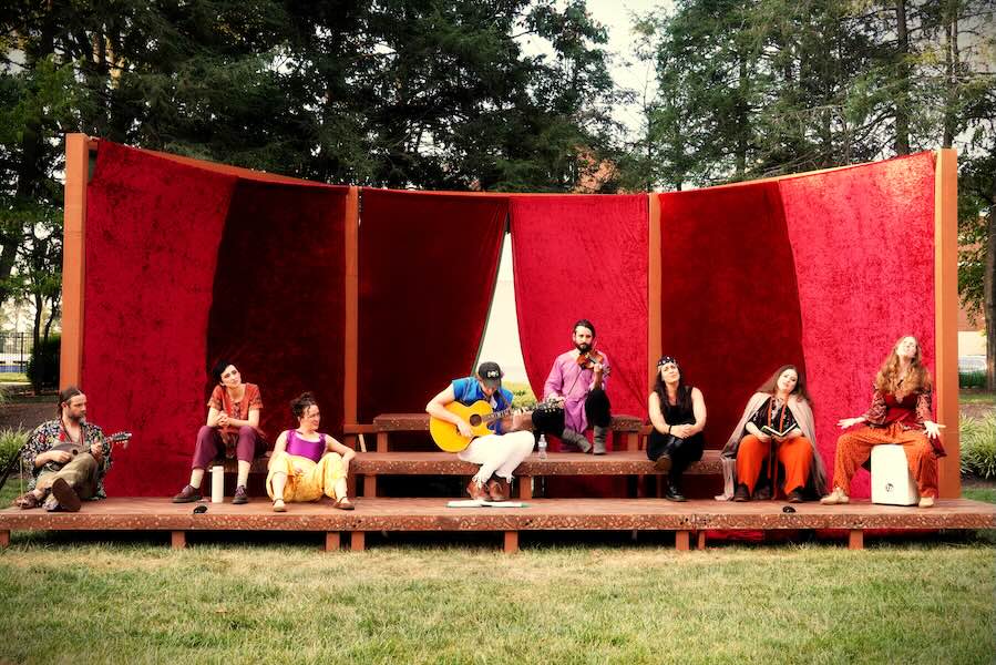 The show opens with most of the cast gathered around the stage, several wielding instruments, laughing and singing, wearing colorful costumes that blend Sgt. Pepper’s-esque ’60s aesthetic with a medieval cut. But director Evan Crump’s take on the play doesn’t only musicalize the Bard’s original songs; it also incorporates pop and rock classics that mirror the story about to play out. Songs like The Kinks’ “Lola,” Simon and Garfunkel’s “Celia,” and Tammy Wynette’s “Stand by Your Man” are a wink to some of the play’s themes and characters. Because As You Like It is the original mistaken-identity, cross-dressing rom-com.