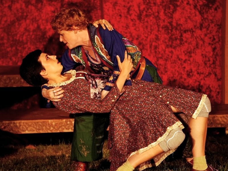 Rosalind (Maureen O’Neal) and Orlando (Jacob Waeyaert) meet at the Duke of Frederick’s (Brian Keith MacDonald) court, and that brief encounter sparks an almost obsessive passion (no one gets young love quite like Shakespeare). Unfortunately, Rosalind is banished by her uncle, the duke, and flees to the Forest of Arden with her cousin Celia (Kira Simmons) and the court jester Touchstone (MacDonald). For protection (and also on a whim), Rosalind decides to disguise herself as a young man named Ganymede.