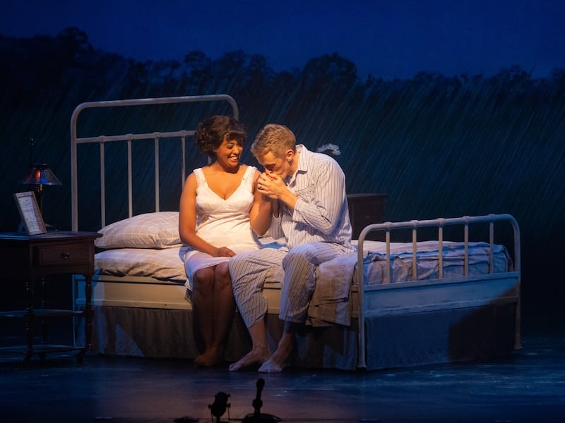 The writers had the task of intertwining the deeply personal stories of Richard and Mildred and their families and the legal process that led to the landmark 1967 Supreme Court decision bearing their name. They, and director Denyce Graves-Montgomery, chose an interesting staging device to help tell the legal story. A “law chorus” of several identically clad ensemble members symbolized the impersonal demands of the legal system, most effectively when the group, with undulating movements, surrounds Mildred when she is jailed for the crime of living with her husband. Geter’s scoring for the law chorus, and for the scenes in which the Lovings are brought into the local court, emphasizes rat-a-tat Morse code–like motifs, punctuated by loud gavel bangs.