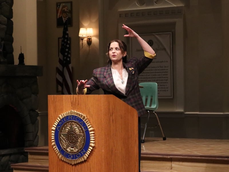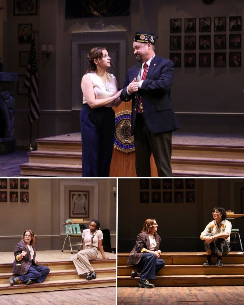 The Round House production’s changes to the 2017 version of the play (which remains viewable on Amazon Prime) are timely, often subtle, and fit seamlessly into the flow of the script. One prominent update is the insertion of an excerpt from Justice Thomas’s questioning of an attorney during the oral argument in Dobbs v. Jackson Women’s Health Organization (2022), which eliminated constitutional protections for women’s reproductive decisions. The production also changes the character of Mike, the Legionnaire who supervises the speech competition at the beginning of the show. In the original production, Mike is a gay man who speaks of the difficulties of growing up in an unsupportive community. Here, played warmly and sympathetically by Michael Glenn, Mike is a father challenged by how to raise a son in a still-misogynistic society.