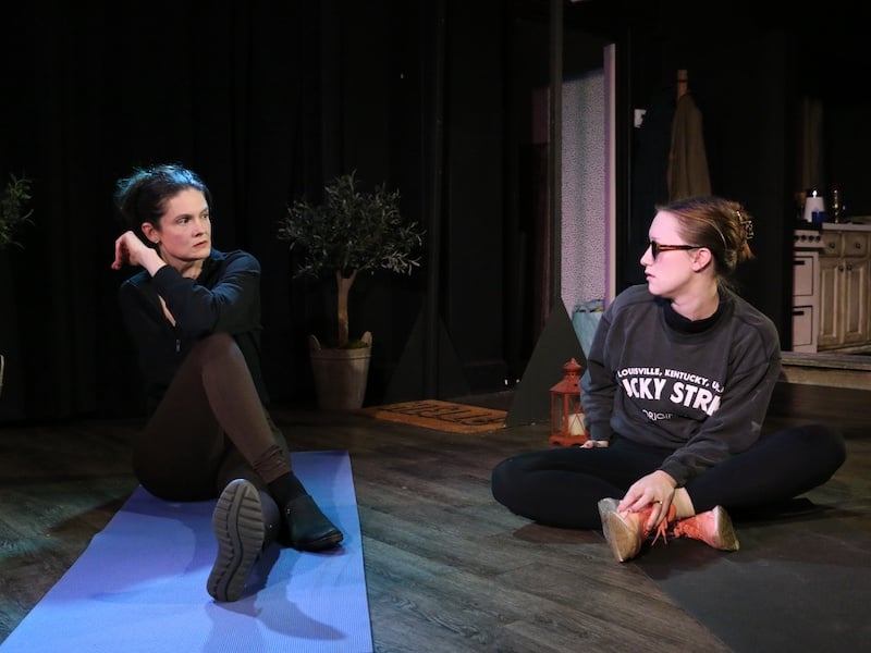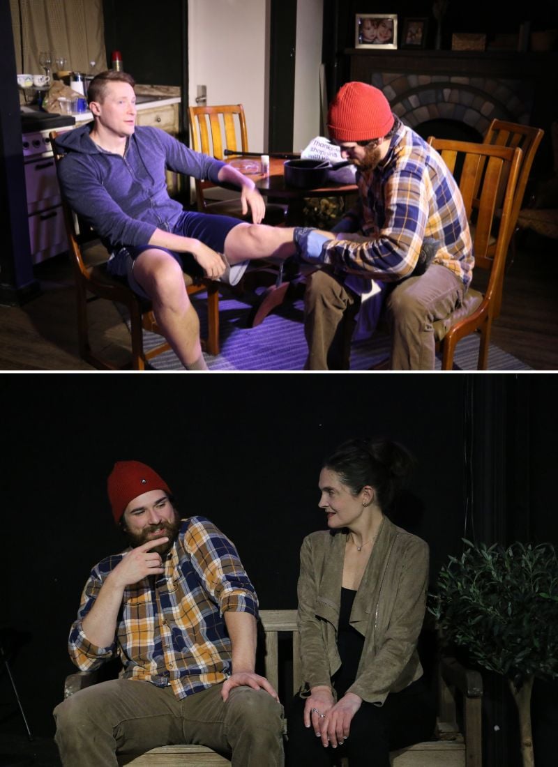 All four actors do a sterling job of making their characters real. In NOVA Nightsky’s space — the theatrical analog of a tiny house — the audience gets to be in the room with the actors, up close and personal (Nettinga landed literally at my feet during a yoga scene, for example). This tends to favor subtlety and realism in acting style. As audience members, we are seeing close-ups of the actors, who in turn can communicate through fine details of gesture and facial expression reminiscent of good film acting. This cast does it well, with clarity.