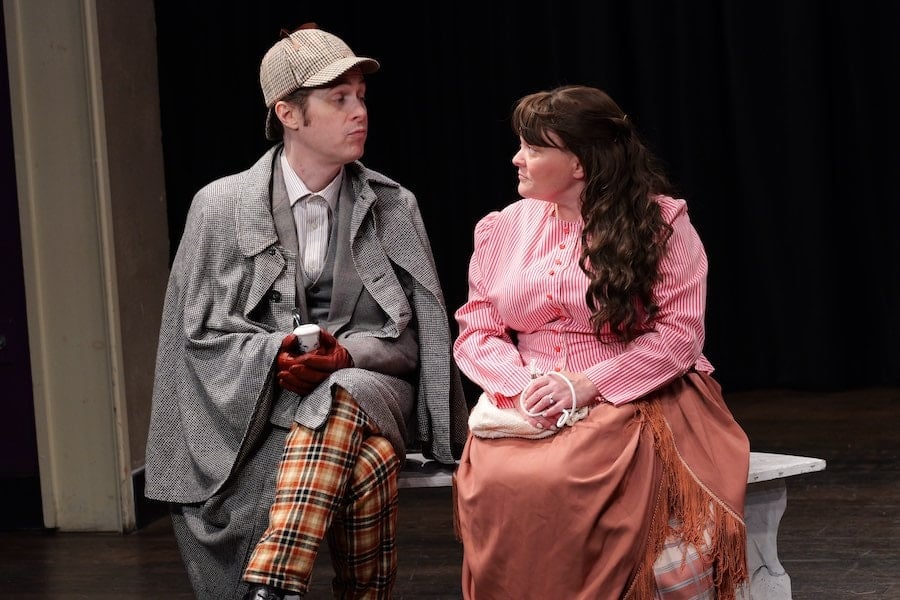 R. Hamilton Wright’s script is solid, if a bit wordy and convoluted. I admit to scratching my head a few times trying to figure out who did what, but it all tied up nicely at the end. My jaw also dropped with amazement at the skill with which Cor Estoll handled this mountain of dialogue. Estoll plays Holmes with such conviction that you would swear he was a neurotic British Victorian detective rather than an FDA employee who first started acting only four years ago. Estoll’s accent was spot on, and as he was onstage for nearly the entirety of the production, he really carried the show. A disappointing performance in this role would spell disaster for the entire show, but Estoll rose to the occasion and then some. Estoll had great rapport with Avery Morstan, who was thoroughly entertaining as Dr. Watson.