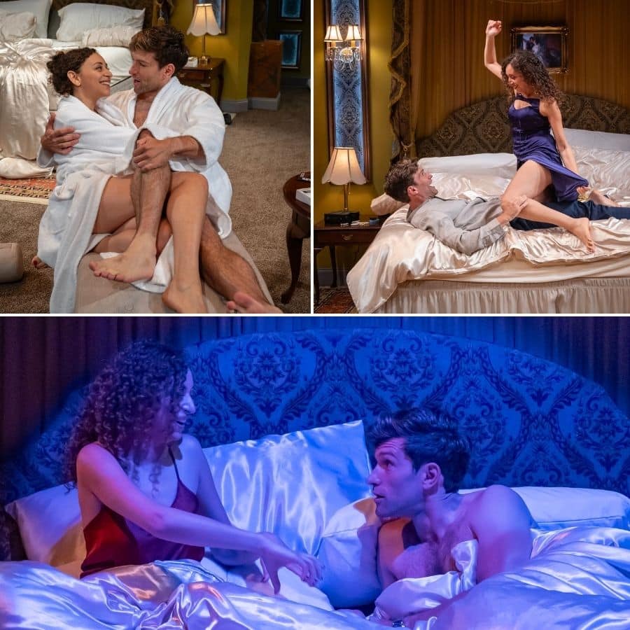 This peremptory astrologer, not unlike a mischievous dramatist, has prescribed all the parameters: no phones, no one else in the room, curtains drawn, just the two of them, plus room service. Jason and Samira, being very into each other, waste no time converging their corporeal bodies such that over the course of this very straight play by Kareem Fahmy, they enact some of the most extensive and artfully hot intimacy coordination likely to be seen on a DC stage (shoutout to intimacy director Sierra Young). Thus in the following tumult of intimate scenes from three days of Jason and Samira’s marriage, we witness a beguiling amalgam of astrology and erotica verité.