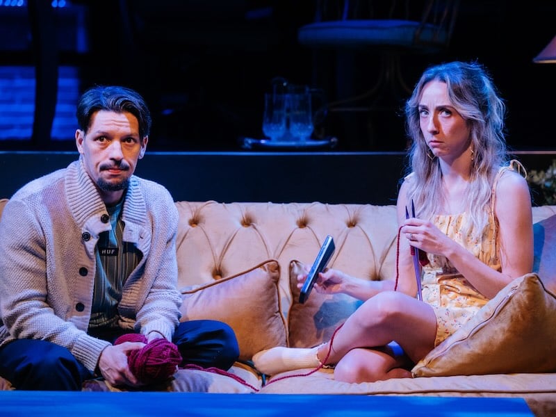 Case in point, the next scene, where we meet Lily (Irene Hamilton), who is being visited by Owen in her and Martin’s living room. She is knitting to alleviate stress. She lets Owen know that Martin has told her Owen loves her. The scene devolves into Lily screaming hilariously into a pillow. In no time at all, Kalleres’ comedically scripted chain reaction of surprise events and minibombshell revelations has become, under Ray Ficca’s swift and savvy direction, the theatrical equivalent of a page-turner.