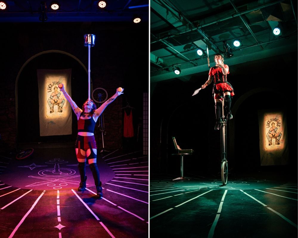 She wheels onstage perched on a unicycle, dressed in a fetching burlesque-ish getup, and proceeds with witty banter, winning charm, and some serious circus skills to transfix us with an intimate immediacy that compares to any of DC’s top solo shows. This singular artist, Lucy Eden, has come to town during WorldPride from California’s Bay Area, where she typically performs her one-woman comedy juggling act out on the street and the piers. Her extensive background busking has evidently honed an uncanny talent for connecting with an audience — a transcendent experience not to be missed.