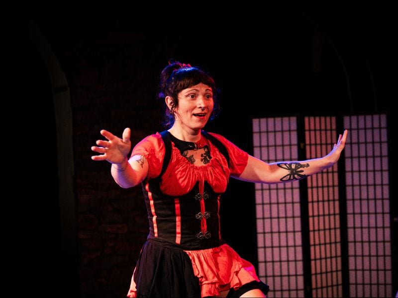 In Spooky Action Theater’s church-basement black box, we are thisclose to a flurry of blades in the air as Eden juggles cleaver-sized knives with disarming ease. Her gregariousness is infectious; she blithely elicits our response in vocalization and applause, and we readily oblige. She has us in the palms of her exceedingly dextrous hands.