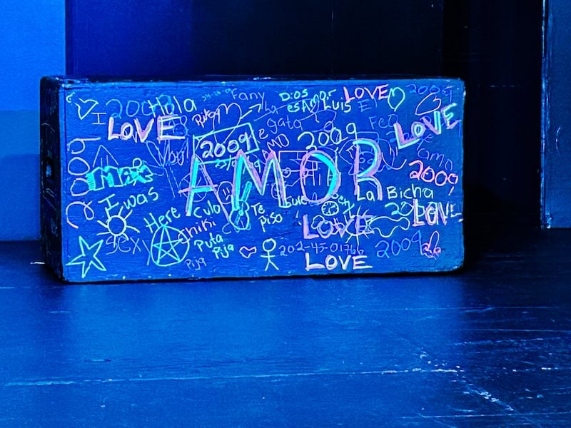 In the center of the stage at Teatro de la Luna’s intimate black box in Petworth is a black block covered with graffiti on the theme of “AMOR” and “LOVE” — hearts and stars and such, scrawled in fluorescent-colored chalk. That simple set piece points to the gist of the play we’re about to see — a queer adolescent’s fateful infatuation with an agemate — but it barely hints at the heart-rending emotionality that will flood the space as Rodin Alcerro’s profoundly affecting two-hander, Pondering About My Memories, unfolds.