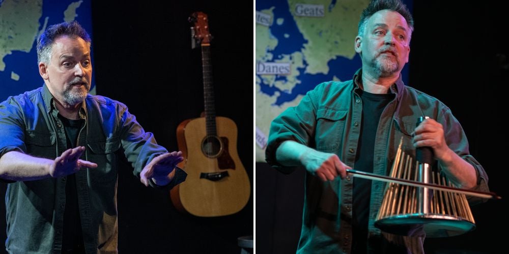 Who knew that an ancient epic poem — the oldest surviving work of English literature — could come off as hyper-relevant to the epically treacherous moment we’re in? With the world premiere of Beowulf, A Retelling — mounted in a cozy black box outfitted with tiny tables and a cash bar — Taffety Punk Theatre Company has delivered a performance experience of uncanny pertinence. Marcus Kyd, artistic director and co-founder of the company, freely adapted the text, and for about an hour and a half on stage solo, he transfixes us as Storyteller and a singer-musician. As soon as the show I saw was over, I knew I wanted to talk with him about what he had achieved, and he graciously made time for a conversation on Zoom, edited here for length and clarity.