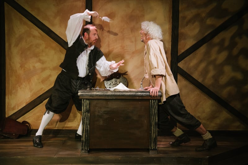 Lots of those games are played by MET Ensemble Member Bill Dennison, who keeps up quite well, and looks right at home as William Shakespeare, adopting all the flourishes and quirks of landed gentry with aplomb. The stress and strife of plague-filled Jacobean times are beginning to wear on him, and you can see the desperation in his eyes. He needs his audience, his accolades, his…escorts. However, he’s stuck at home with his manservant, Francis Sir, played with cartoonish enthusiasm by MET Ensemble Member Jeremy Myers. The two have a wonderfully playful chemistry, and, with all the physical comedy he’s asked to do, Myers plays a convincing human rag doll. He has the pleasure of saying some of the script’s most absurd lines, and he gets to be the personification of Chekhov’s gun when he says he “swoons at blood,” but I’ll give you no spoilers beyond that.