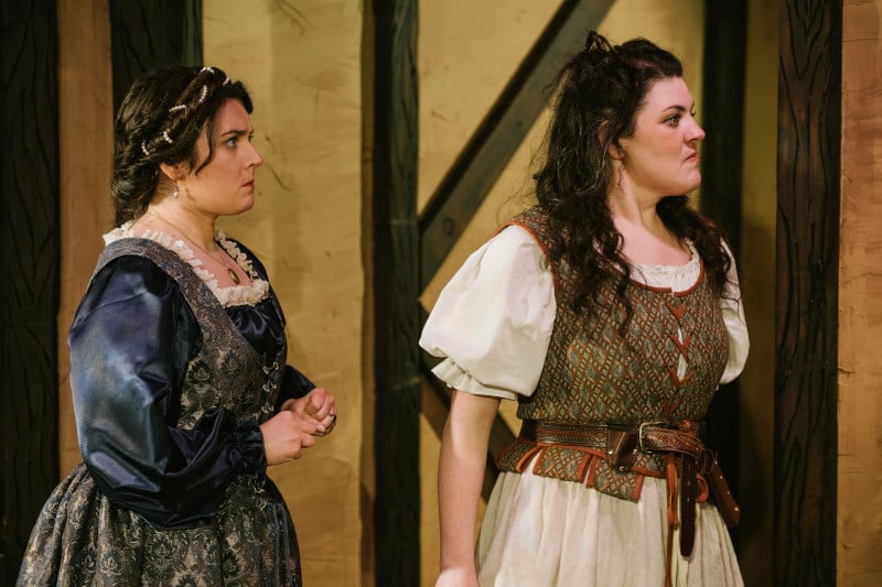 Green is perfectly cast as Jane, with that mischievous glint in her eye that always makes for a strong character actor. She’s believable as a street scamp who performs spells, talks to dead rats, and brandishes a rapier. She’s confident, lively, and engaging in the aforementioned audience interaction bits, and is, above all, a Real Person™. I feel a little bad for Green for having to throwing herself under the bus repeatedly for the sake of men’s egos, but she has fun with it. Jane knows she has to feign incompetence and be the “silly little thing” they want her to be. Fortunately, we’re in on the joke.