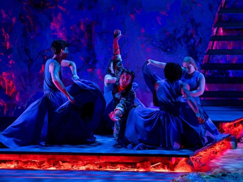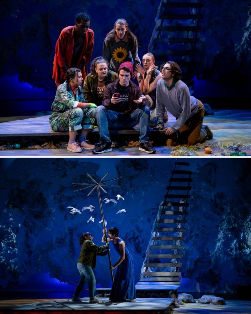 As a bonus, the ensemble is omnipresent, executing impactful dance moments and manipulating the puppets that punctuate most scenes. The company’s costumes create an undulating ocean with their long sleeveless dresses of seafoam-dusted blue fabric, and they are used to great effect in the dance interludes and puppeteering scenes. The lighting is a favorite element, with bold choices like performer-held bulbs and total color washes that evoke significant emotion. The music in this production also seems carefully chosen, bringing us to a quiet place with contemplative piano pieces, while alternately energizing us with viral TikTok songs.