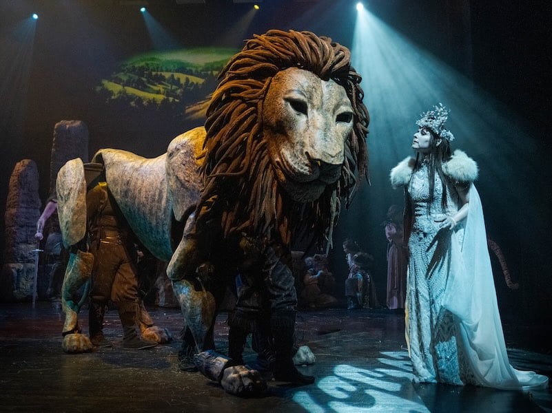 The Logos Theatre uses an expansive cast and crew to keep the adventure (and its many parts!) moving seamlessly. Jesse Gould’s set design and Jeremiah Gould’s visual effects, including projections on the side and back walls of the theater, use every inch of the World Stage Theater space and give the illusion of a much larger world. Movable set pieces, including the titular wardrobe, the Beavers’ stick-framed home, and the imposing Stone Table, are skillfully rotated between scenes, often concealing or setting up character and costume changes. The characters walk through the aisles to the right and left of the stage, and between the two sections of the orchestra seating, immersing audiences in the story. My eight-year-old and I sat in the back row of the first orchestra section and experienced a great thrill when the life-sized puppet Aslan (designed and operated by a team of puppeteers led by Justin Swain) walked right behind us, near enough to touch.