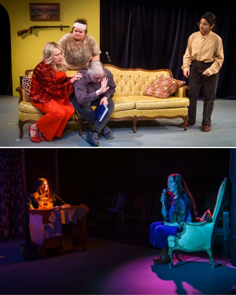 TOP: Jaki Demarest (Arkadina), Marianne Virnelson (Constantine), Mikki Barry (Sorin), and Kashaf Jabbar (Medviedenko); ABOVE: Marianne Virnelson (Constantine) and Aisling Mockler (Nina), in ‘The Seagull.’ Photos by Rachel Zirkin Duda.