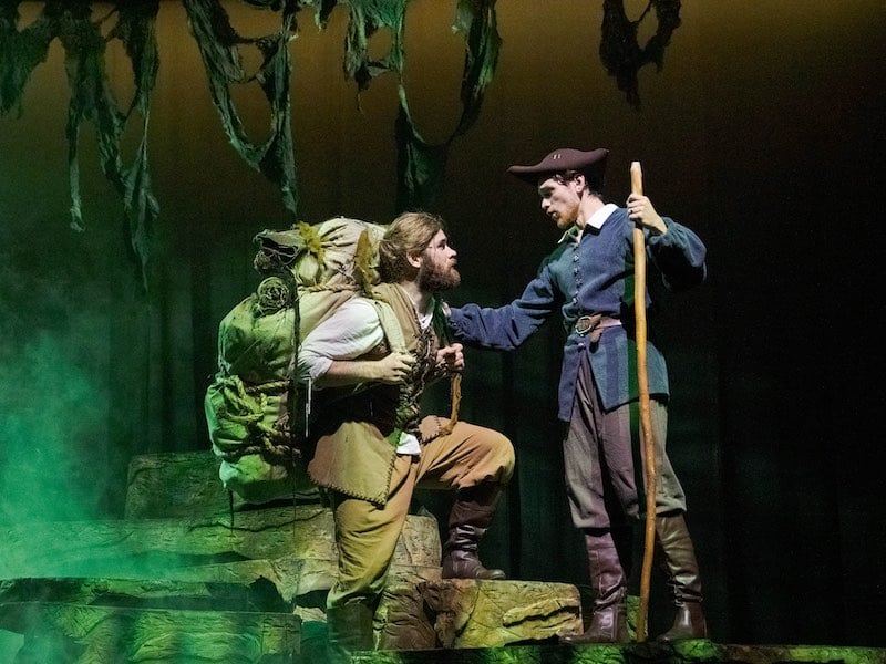 Viewed through this lens, Evangelist (a name and role fraught with baggage in the 21st century) becomes the messenger calling Pilgrim to the adventure of his life. When Pilgrim encounters the cross in the first act, his burden (and the accusers that have been hounding him) fall away. He receives the new name of Christian, and he is given white robes to cover his shabby brown tunic and breeches (costume design by Lucy Parker), which powerfully evokes both Christian conversion and the crossing of the threshold into a new stage of adventure. For Pilgrim (now Christian), this is not the end but merely the beginning, as he has a long journey — and many trials — yet ahead of him.