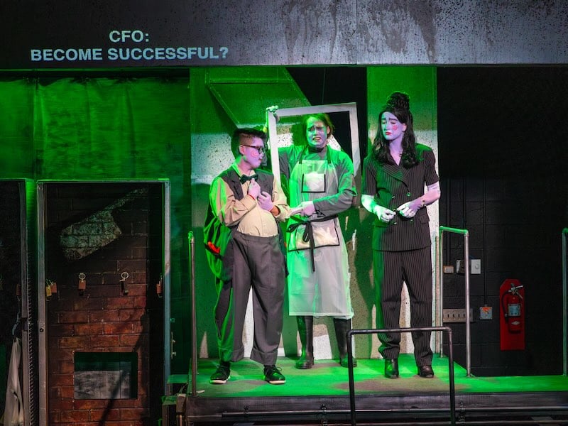 Meat Expectations is a morality play, a fable of inheritance, survival, community, investment of people in themselves and the betrayal of that trust. The show features the type of buffoonery, slapstick, song, and dance that you would experience in an English pantomime performance. Consistent with being a morality play, the characters do not have personal names but rather are named by their role: CEO, CFO, Foreman, Butcher, Loudmouth, etc. The costumes and makeup reflect this fantastical and archetypal aspect of the story. Everyone has exaggerated, cartoonish makeup and hair. The meat cleavers are cut-outs. The CFO, an obviously slender person, is dressed in a fat suit. The entire cast takes to their roles with infectious energy and enjoyment. But special note must be made of Jayce Yeh, whose ecstatic, off-balance, and whirling-dervish dancing as the egotistical, self-serving CFO frequently threatened to take flight and filled the audience with amazement and delight.