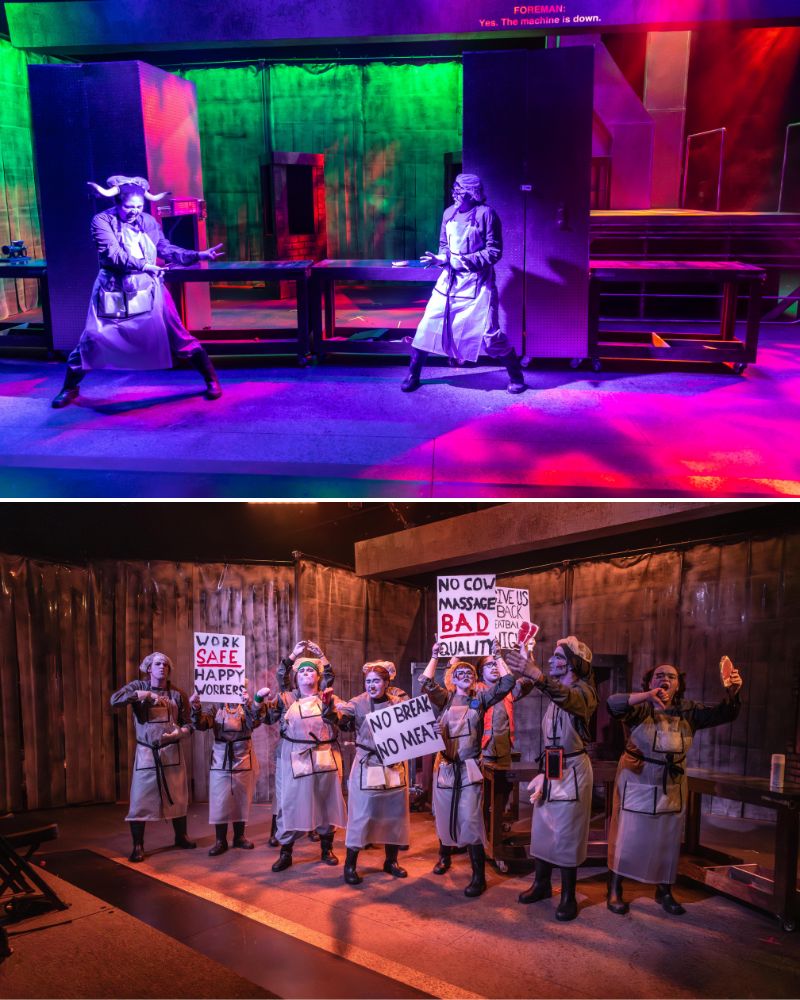 Ethan Sinott’s industrial, metallic gray set, with vertical vinyl panels that keep the cold of the refrigeration confined without impeding movement through the spaces, evokes the no-nonsense desolation of a workspace devoted to making a profit from the blood of animals. (No judgment here. I mean, at Meat Expectations, the cows do get a massage beforehand, and they leave this veil of tears in a state of contentment.) But there is nothing frivolous about this space of panels and metal with no color or design to distract from the chopping and packaging of cow’s flesh. As the CFO is allowed to implement increasingly inhumane innovations, the music rumbles and grinds to announce the entry of the biggest, fastest flesh-chewing machine ever. At one point, the machine eats a portion of the arm of one of the dedicated and exhausted workers.