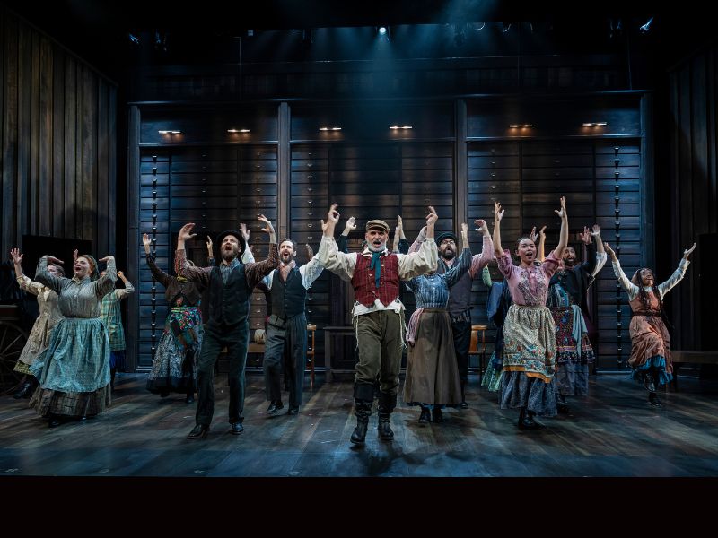 That said, Flynn is to be commended for the creative team he has pulled together. Choreography by Lorna Ventura incorporates traditional Jewish dance, most wonderfully in moments of joy like the iconic “To Life” and “The Bottle Dance” at Tzeitel’s wedding. Scenic designer Milagros Ponce de Leon crafts different wooden sets with height and authenticity. Her work meshes beautifully with Max Doolittle’s lighting design in the first act’s “Sabbath Prayer,” with candles in dimly lit windows as a stunning backdrop to the stage. Doolittle’s lighting, overall, is a mix of subtle and striking spotlights — particularly in the closing scene as the cast walks through the light of doors into the new world of America.