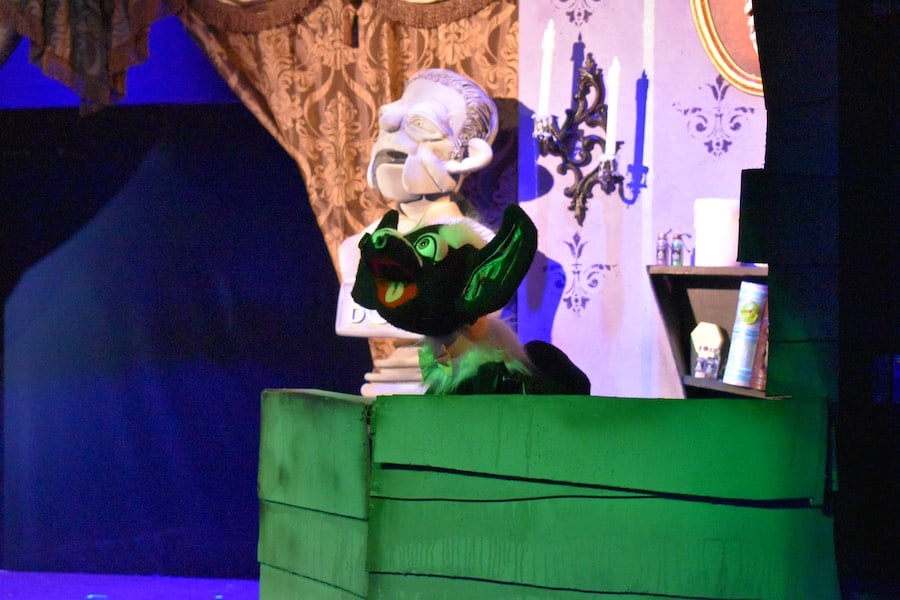 This production, with pumpkins and neon-green lights surrounding the stage and social distancing stickers on the floor, is comfortable and safe Halloween entertainment. The stage design, also from Dapo, looks appropriately spooky as well; the audience is pulled into an old mansion that sets the mood behind the puppeteers, with candles in the center, well-designed stained glass windows on either side, and tombstones that abound.