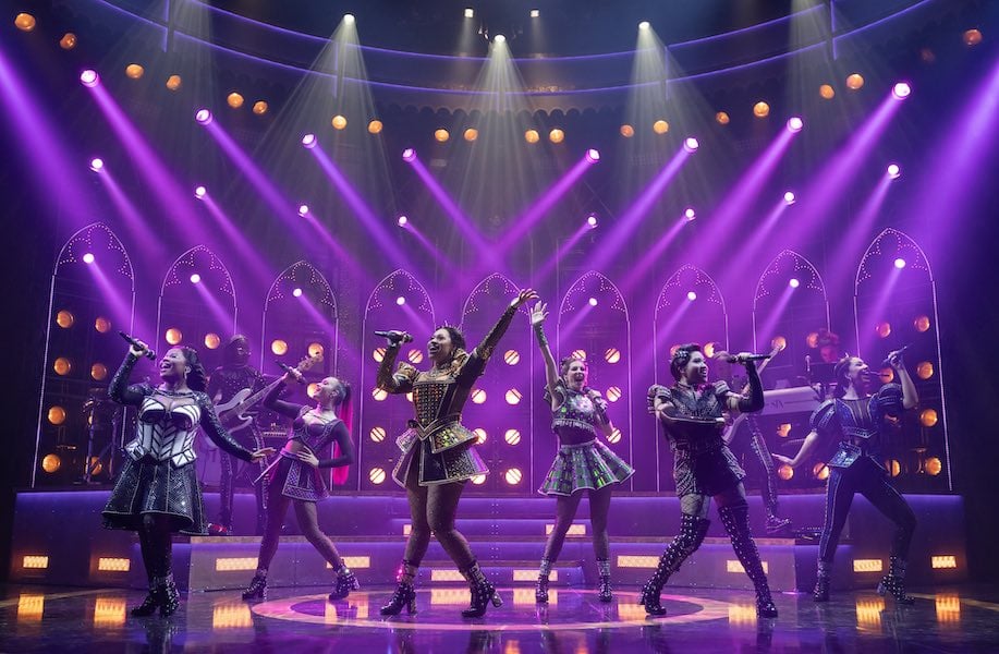 The production is also exceptional for other design elements. Gabriella Slade’s costumes perfectly outfitted each ex-wife specific to her story and attitude and enhanced the story each told about themselves. While each of them had a rock star look, each rhinestone, bustier, jacket, miniskirt, or over-the-knee boots sold that queen’s story. Each costume detail amplified it, such as the chokers worn by the beheaded queens. I also loved the hip holsters where the queens stashed their microphones. Practical genius.