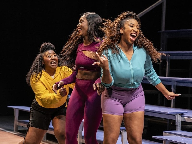 The principal set, by Scenic Designer Paige Hathaway, is a realistically rendered bleacher high rise, which allows the actors space for group routines as well as individual vertical and lateral movement. This uncluttered stage also compels the audience to confront the emotion and tension of the story. We cannot look away. Less successful is the hidden compartment beneath the stadium grounds because it’s difficult to see its contours and interior except from the front of the house. Lighting Designer Minjoo Kim’s stadium lights augment the theme of visibility because — they are on through the duration — while secondarily enhancing the mystery embedded in the odd events the team experiences during practices. Danielle Preston’s costumes are spot-on. Her practice outfits perfectly match each team member’s personality and style.
