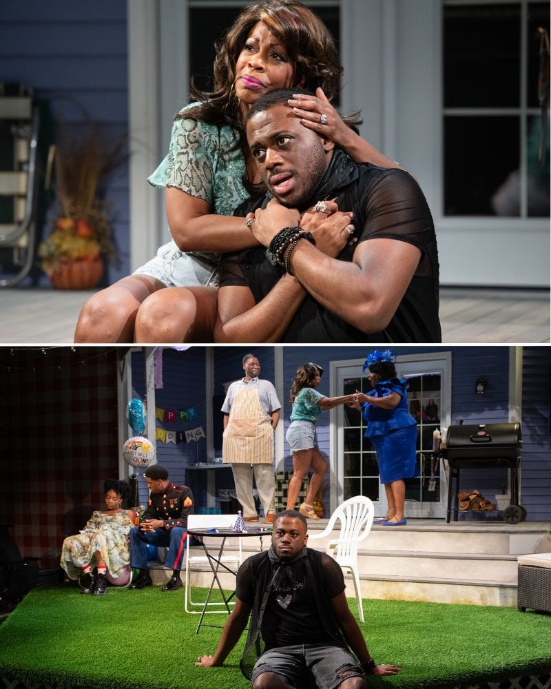 Director Taylor Reynolds should also be commended for bringing the audience into the story in a way that was impossible during the Broadway run. I first saw Fat Ham there and wondered how it would transfer to a smaller venue like the Mead at Studio. Of course, the Broadway show was fabulous, and seeing it on Black Theater Night made the performance even more spectacular. But I have to say, I like the Reynolds-directed production at Studio even more. Her staging decisions pulled us into the action. The light changes clearly indicated the actors were breaking the fourth wall and added to the narrative by spotlighting them and allowing us to focus. Indeed, the actors made eye contact with the audience throughout, seeking agreement or understanding. Their emotions were palpable. Their energy leaped from the stage. I felt like a guest at a family barbeque watching a family expose their vulnerabilities.
