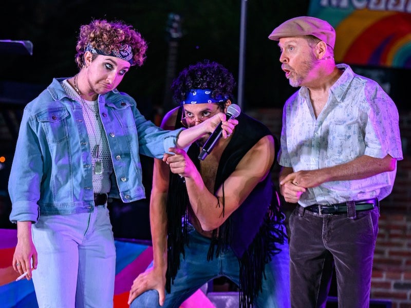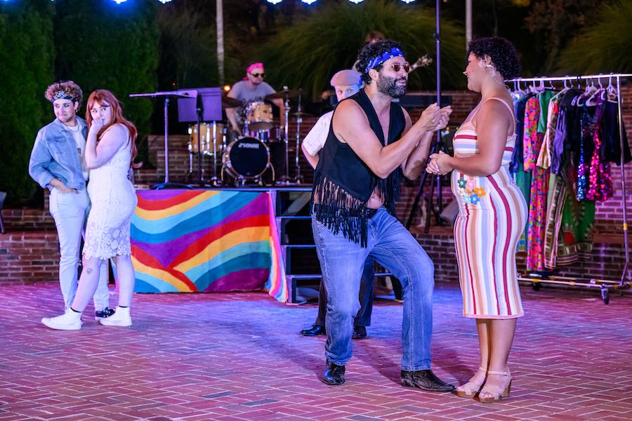 The City of Fairfax Theatre Company’s outdoor production of Much Ado About Nothing sets Shakespeare’s arguably best-loved romcom behind the scenes of a 1975 music festival. We’re talking bellbottoms, fringe vests, and haze from indeterminate sources. The play’s plot is framed as the goings-on behind the scenes of the concert that’s taking place as the musicians finish a tour, as opposed to returning from war, though many musicians would likely not see the distinction.