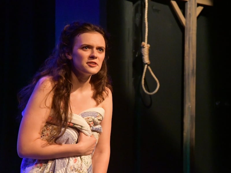 Another leading performance in this production is Malerie Goodman’s as John Proctor’s wife Elizabeth. She is utterly convincing as a woman both skeptical of her husband’s fidelity and emotionally weathered by a society that degrades and disregards her; in her final scene, as she has been imprisoned and kept in solitary confinement while pregnant, she is difficult to behold on stage — and that’s a sign of good theater. Rebecca J. Harris’s hair and makeup work for Elizabeth in this moment fully communicates her anguish to tear-jerking effect.