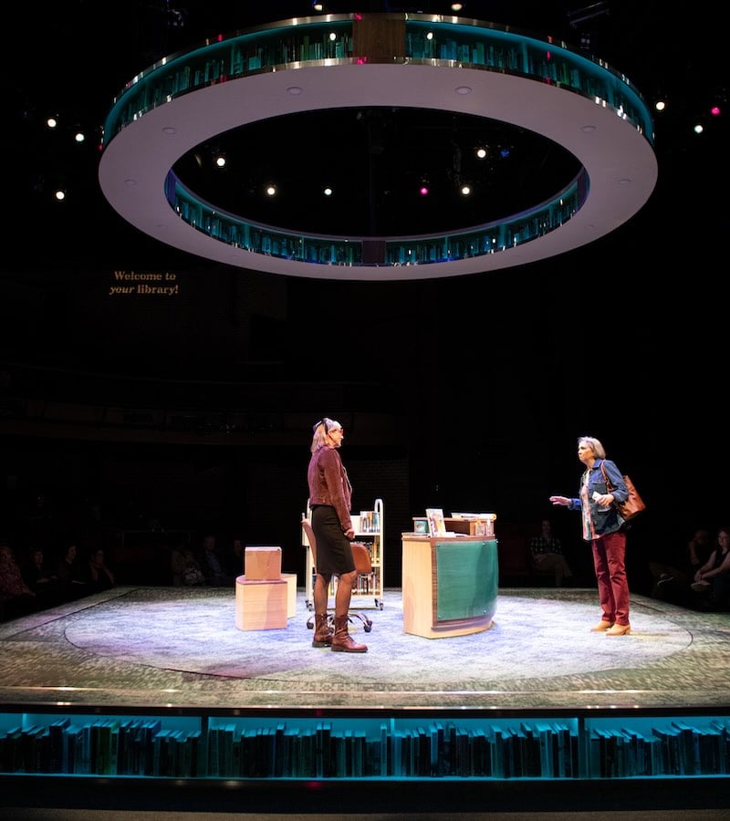 Directed by Round House’s Artistic Director Ryan Rilette, Bad Books is performed in the round. Scenic Designer Meghan Raham’s several set pieces are arranged on a turntable that revolves slowly throughout the production. A bit distracting at first, the movement actually levels the playing field, enabling audiences to experience all sides of the debate. The circular quality is reinforced by Rothstein’s last vignette: what goes around comes around.