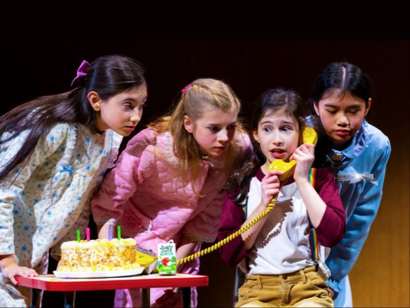 The imp-like, irresistible Aria Kane as Sarah introduces herself at her new school (“Hi, My Name Is Sarah”) with a riptide of verboten language that passed for ordinary discourse at home. (On opening night, one could only wish she had been better miked so we could make out every risqué word.) Shamed by her teacher Mrs. Dembo (Alysha Umphress) and instantly reviled by her cliquish fifth-grade classmates, Sarah stands apart — carelessly dressed, potty-mouthed and undeniably “Jew-y.” Finally, she gains probational status among the “in-girls” — Abby (Emerson Holt Lacayo), Amy (Elin Joy Seiler), and Ally (Alina Santos) — only to be cast out again when they discover her shameful secret.