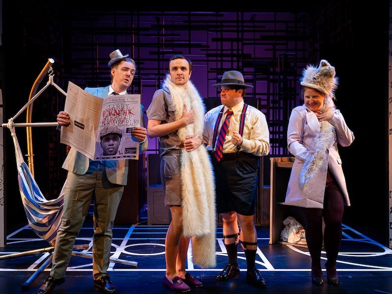 Ethan Sinnott’s handsome set recalls Frank Lloyd Wright’s classic designs from the era. Combining soaring upright panels, geometric floor patterns, and sturdy intersecting metal grids, the set echoes the rhythmic structure of the music itself. It allowed characters to variously surmount, enclose, imprison, or embrace one another as the action moves from scene to scene. With Paul Callahan’s lighting, the stage set effectively spotlights characters for standout solos such as the Moll’s “The Nickel Under Your Foot,” and Ella Hammer’s riveting “Joe Worker,” as well as the vaudevillian duet sung by Mister’s spoiled children, “Spoon Croon.”