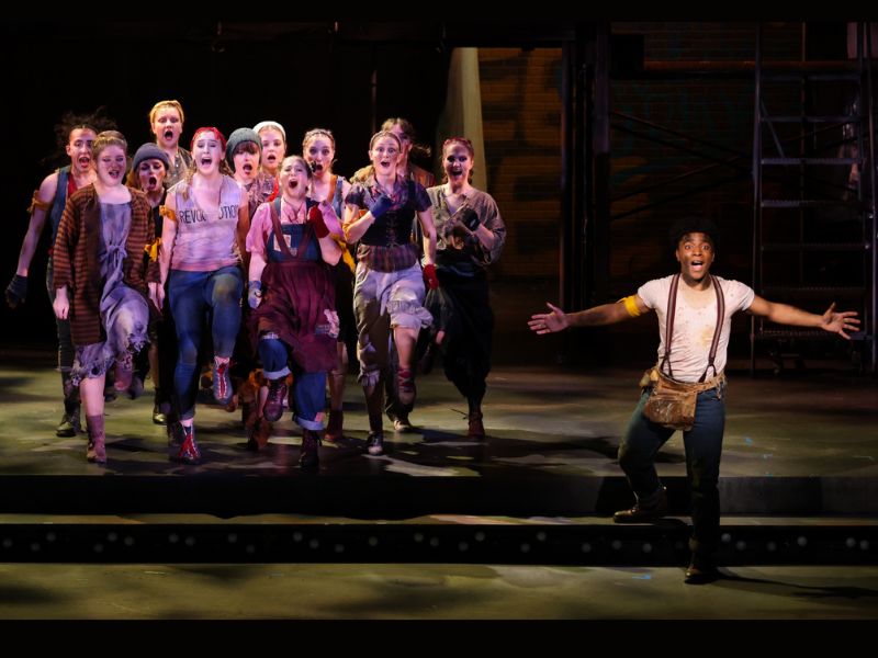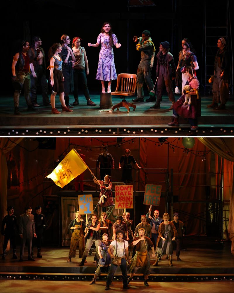 Urinetown’s musical numbers riff on classic American genres, served up with a generous wink and a nod. You’ll hear echoes of Les Misérables and Threepenny Opera in “Urinetown” and “It’s a Privilege to Pee.” “Snuff that Girl” recalls West Side Story. Gospel music inflects “Run, Freedom, Run.” Hope and Bobby swoon in a classic love duet, “Follow Your Heart.” Even the outstanding choreography by Robert Bowen Smith pays homage to esteemed musicals. Cast members re-enact Fiddler on the Roof’s famous “Bottle Dance” as they execute energetic Russian kazoksky kicks while balancing rolls of toilet paper on their broad-brimmed hats. There’s also a wry reference to Surrealism. Watch Sally wave a bright flag signed by R. Mutt, the signature that artist Marcel Duchamp famously scrawled on a ready-made urinal that he exhibited to shocked audiences back in 1917.