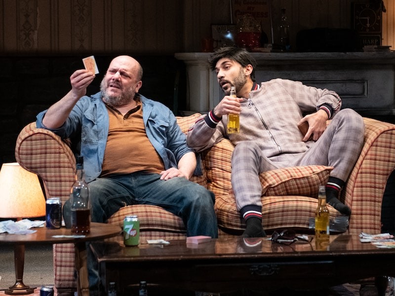 Added to the mix is Ivan Curry (Michael Glenn), a friend so addled by drink that he can’t quite find his way home. He resides temporarily on the Harkins’ couch. Seriously myopic, Ivan has misplaced his glasses and spends most of the play feeling his way around his friends’ living room. The flashy Nicky Giblin (Maboud Ebrahimzadeh), now in possession of Sharky’s former girlfriend as well as his car, is invited by Richard for a festive round of pre-Christmas poker. He shows up with a mysterious guest — the suave Mr. Lockhart (Marcus Kyd) — whose impeccable suit is a sharp contrast to the lads’ slovenly attire.