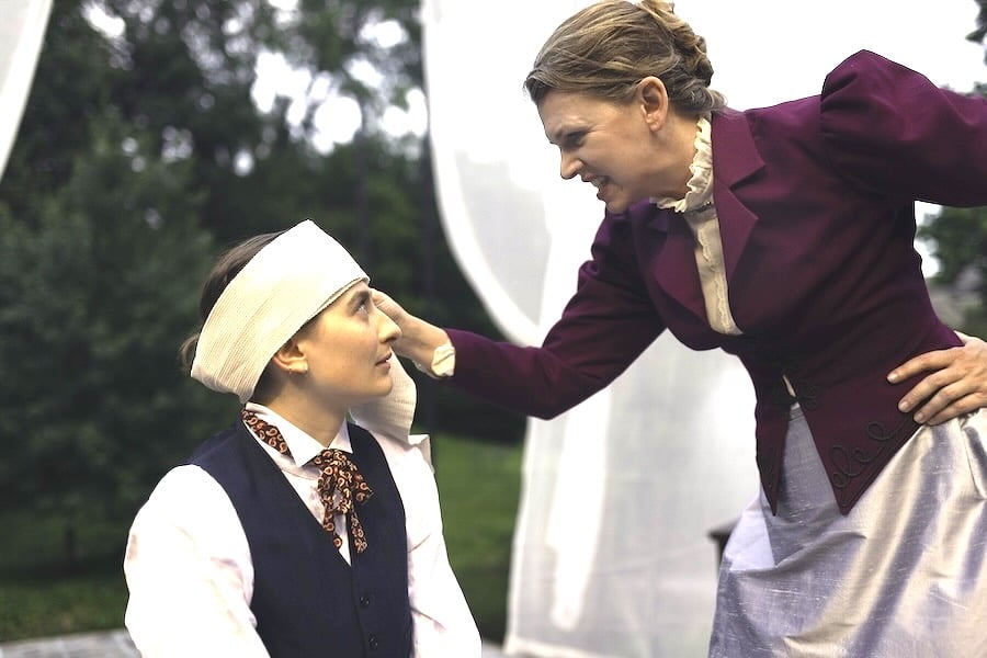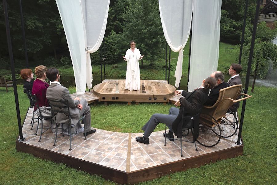 Summer is always a great time to hit the road and explore theater companies yet unseen; this year, for the first time, I hit Pittsburgh because word had it that there was a dynamite production of Anton Chekhov’s classic The Seagull (here simply Seagull). The kicker was that it was staged in a temporary open-air theater on the Chatham University campus, which is as picturesque as it gets. The stage, flanked by frequently opened gauze curtains, was backed by a small pond and surrounded by a green meadow, which was exploited by the cast in ways that were truly delightful to see, with parallel “silent” scenes playing out to complement the onstage dialogue.