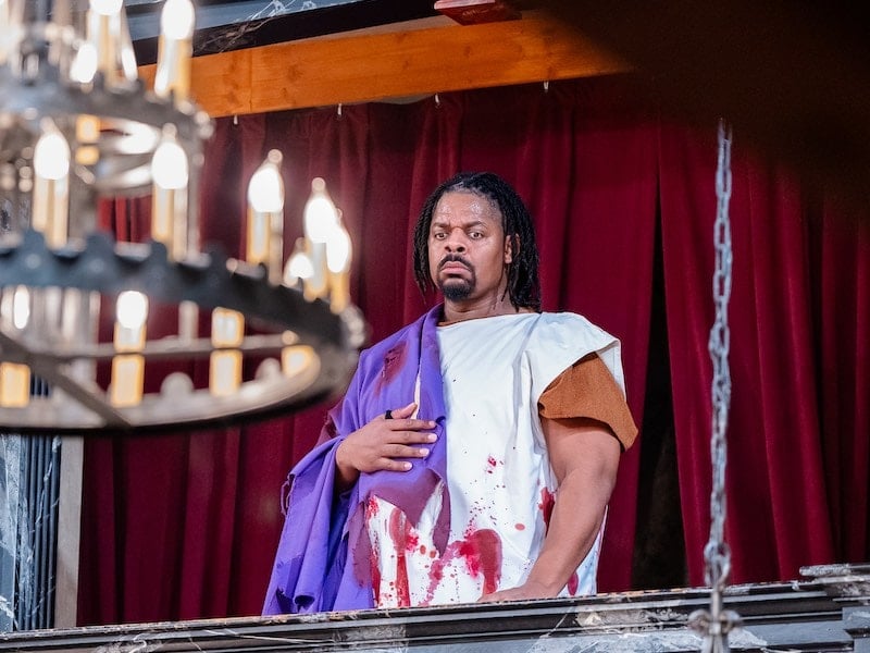 Kenn Hopkins Jr., as Caesar, reminds us that this Roman dictator’s power, and his faith in his own instincts (while flawed, in the final analysis), were unshakable. In the musical pre-show, Hopkins also shows off his musical chops with a stirring take on the O’Jays’ hit “The Back Stabbers.”