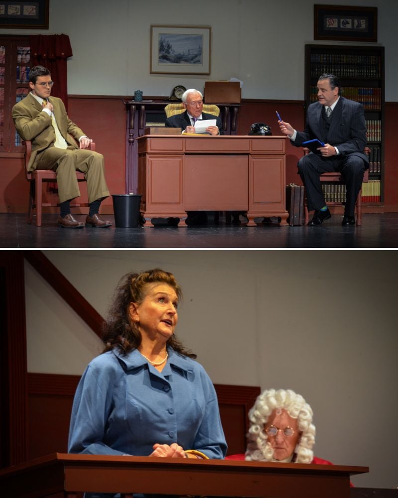 Dan Lavanga’s set design leans heavily into the world of naturalism; the two locations are realistic representations of an English courtroom and an attorney’s chambers. Linda Swann’s costumes are befitting the 1950s, with high-waisted suits for the gentlemen and flared silhouettes for the women. Alan Barnett’s direction smartly places the audience into the seats of the jurors, with attorneys, witnesses, and the defendant playing directly out past the apron. I would have personally preferred a bit more dynamic movement and consistent playing to the jury/audience throughout, but I understand and appreciate the choice to present a more realistic courtroom environment on stage.