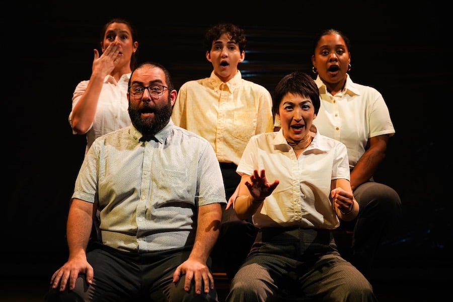 The performances by this ensemble cast — Janine Baumgardner, Oz Heiligman, Jennifer Knight, Lee Liebeskind, Isabelle Pickering, and Jasmine Proctor — were uniformly brilliant. They are a truly balanced group of actors, feeding off each other’s energy and creating space for each performer to stand out in their own specific moments. Despite the comic and kitschy surfaces of their many characters, the performers played each part with grim sincerity. From extreme accents and clownish facial expressions to the genuine sadness of a robot who cannot grow like a real boy, this ensemble shines in the contradictions they represent.
