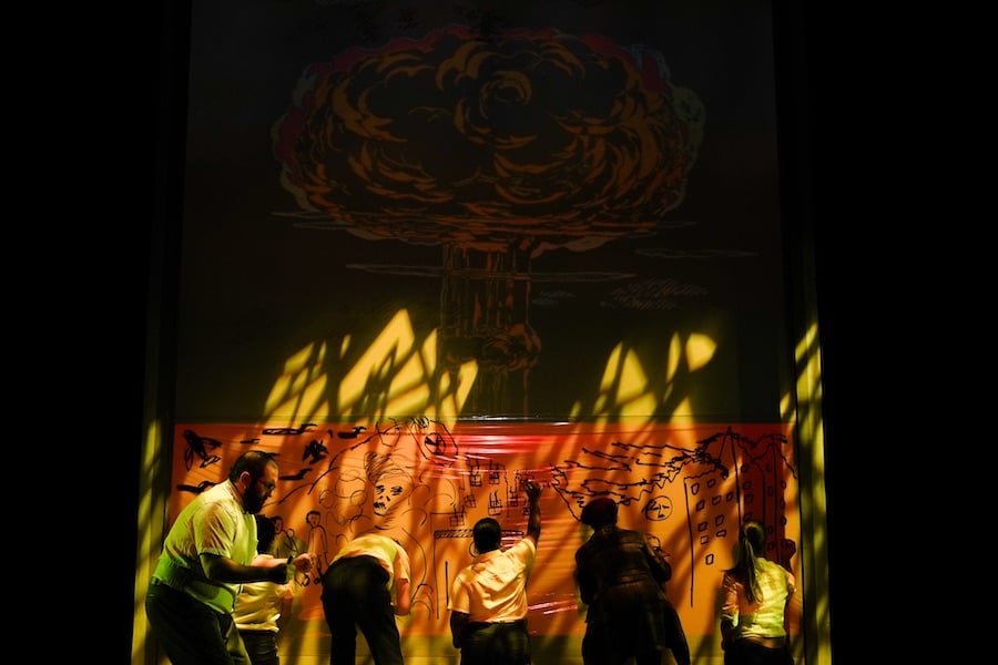 This play thrives in the multimedia. I found myself consistently surprised and elated by the imaginative ways Director Dylan Arredondo and the designers played with theatrical conventions. Held together by the intrepid ensemble, the artistic team created a (mostly) seamless blend of live performance with technological innovation. The melding of projections (Mark Costello) and lighting (Dylan Uremovich) in particular was truly a sight to behold. One of the production’s most spectacular moments occurs while Tezuka is drawing comics under a desk during an air raid. The cast drew scenes of war in front of us while the cacophonous and overstimulating sights and sounds of war drowned the room. They created an overwhelming and visceral experience — exactly what that moment required — an experience that could only have been achieved in this kind of theatrical space. The choreography of the performers as they experienced these disturbing, heartbreaking, and deathly moments of war, all while making art in front of us, depicted the difficult and disturbing relationship between war, trauma, and the artistic spirit.
