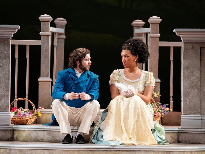 The element that truly brought this production together was the collaboration between Murphy-Nathans and Choreographer Adriane Fang. With anachronistic music à la Bridgerton, Fang’s choreography is a brilliant mash-up of period movement with contemporary flair Often, ball scenes can become a bit monotonous and difficult to follow, but the combination of dance styles, brilliantly executed by the cast, and the choice to limit the number of couples dancing at any single moment made these important moments so much more enjoyable than I expected. Not to mention, the sweeping pre-intermission dance between Okoye’s Emma and Hudson White’s Frank Churchill to Taylor Swift’s “Wildest Dreams” was just about as romantic as it gets.