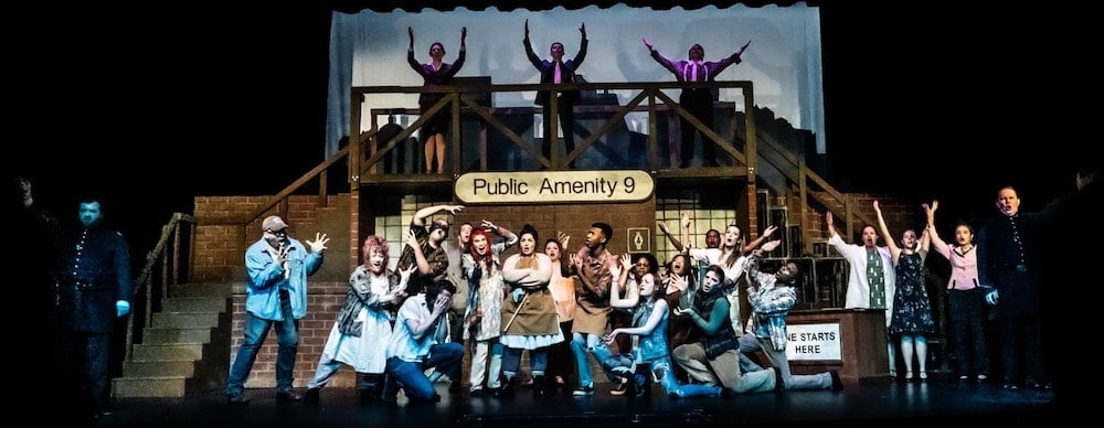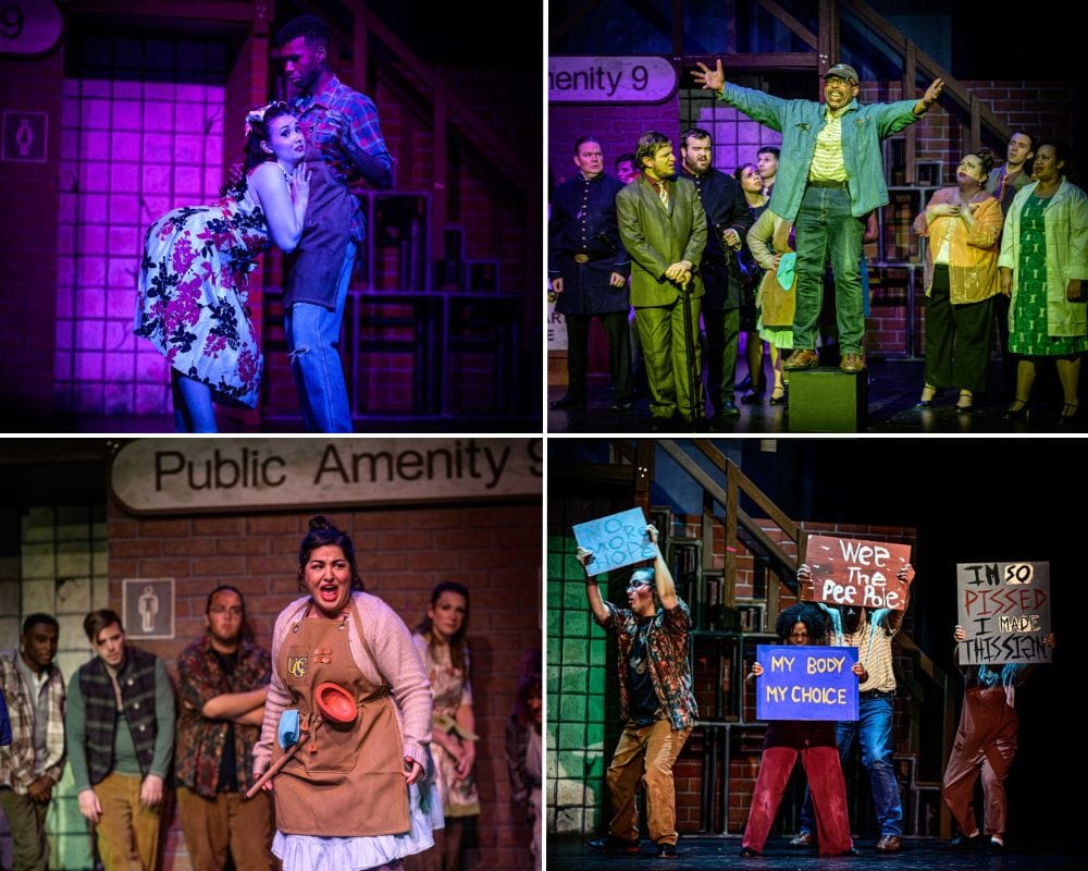 After a short but idyllic walk through the woods to the Bowie Playhouse, my partner and I took our seats among the bustling opening night crowd. Even in the dim light of the preshow, Gene Valendo’s set truly captured the look and feel of a grungy subway bathroom. It stood in stark contrast to the polished Cladwell office, ushered in and out of the space by Ms. McQueen (Cladwell’s long-suffering assistant, played beautifully by Crista Drysdale). The scenic design as a whole gave the cast a wide range of elevations to play with, no doubt helping Director Davis Wootton-Klebanoff create some truly wonderful stage pictures throughout the production. The overall aesthetic is completed by Mary Wakefield’s costumes — appropriately filthy for the citizens of Urinetown and, for Cladwell and his cronies, eerily similar to the fashion of Wall Street in the 1980s.