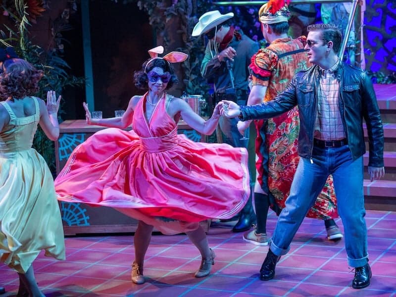 Lighting Designer Adam Mendelson dims the lights in between scenes, as well as for night scenes. Sound Designer Folger Ridout plays classic 1950s songs throughout, usually commenting on the action. Donald Hicken and Sally Boyett keep the actors constantly moving around the stage, often to great comic effect. Benedick and Beatrice’s eavesdropping scenes are particularly hilarious. The dancing, with Mackenzie Koehne as dance captain, is a beautiful treat, especially one done to the “Tequilla” song, using spins and twirls, and uniquely passing around a bottle. The actors ensure that Shakespeare’s language feels natural even in the more modern setting. It feels reminiscent of a Cole Porter musical adaptation of Shakespeare. Everything comes together for an evening of delightful comedy with a bite, surprising at times while remaining familiar.